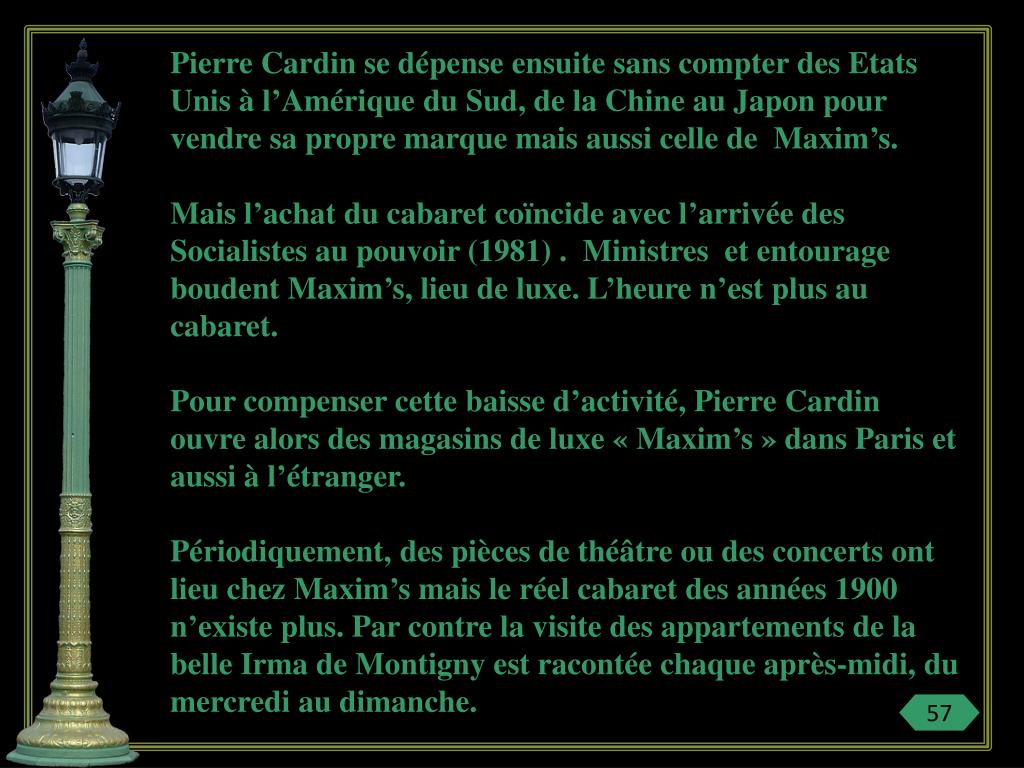 Pierre Cardin se dépense ensuite sans compter des Etats Unis à l’Amérique du Sud, de la Chine au Japon pour vendre sa propre marque mais aussi celle de Maxim’s. • Mais l’achat du cabaret coïncide avec l’arrivée des Socialistes au pouvoir (1981) . Ministres et entourage boudent Maxim’s, lieu de luxe. L’heure n’est plus au cabaret. • Pour compenser cette baisse d’activité, Pierre Cardin ouvre alors des magasins de luxe « Maxim’s » dans Paris et aussi à l’étranger. • Périodiquement, des pièces de théâtre ou des concerts ont lieu chez Maxim’s mais le réel cabaret des années 1900 n’existe plus. Par contre la visite des appartements de la belle Irma de Montigny est racontée chaque après-midi, du mercredi au dimanche. 57