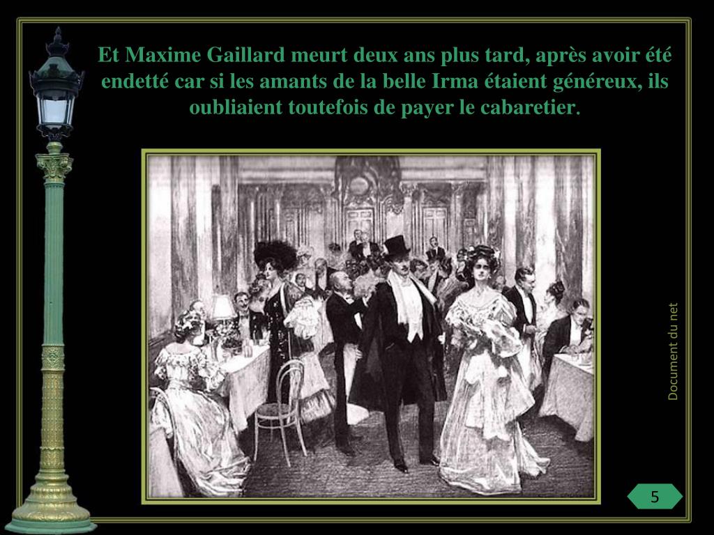 Et Maxime Gaillard meurt deux ans plus tard, après avoir été endetté car si les amants de la belle Irma étaient généreux, ils oubliaient toutefois de payer le cabaretier. Document du net 5