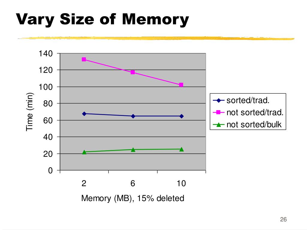 Tests • Vary number of deleted records • Vary number of indices • Vary height of indices • Vary size of memory • Clustered tableDiagrams: • not sorted/trad: • sorted/trad • not sorted/bulk Delete set not sorted, traditional approach Delete set sorted, traditional approach Delete set not sorted, vertical approach