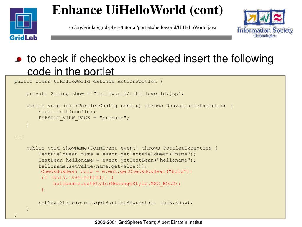 Enhance UiHelloWorld (cont) src/org/gridlab/gridsphere/tutorial/portlets/helloworld/UiHelloWorld.java • to check if checkbox is checked insert the following code in the portlet public class UiHelloWorld extends ActionPortlet { private String show = "helloworld/uihelloworld.jsp"; public void init(PortletConfig config) throws UnavailableException { super.init(config); DEFAULT_VIEW_PAGE = "prepare"; } ... public void showName(FormEvent event) throws PortletException { TextFieldBean name = event.getTextFieldBean("name"); TextBean helloname = event.getTextBean("helloname"); helloname.setValue(name.getValue()); setNextState(event.getPortletRequest(), this.show); } } CheckBoxBean bold = event.getCheckBoxBean("bold"); if (bold.isSelected()) { helloname.setStyle(MessageStyle.MSG_BOLD); }