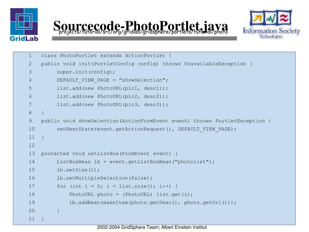PhotoPortlet • PhotoPortlet is a simple Portlet which shows a fixed number of pictures from an url. Pictures are local on tomcat and came with tutorial webapp. • We are going to change that! • project dir: gridsphere/project/tutorial