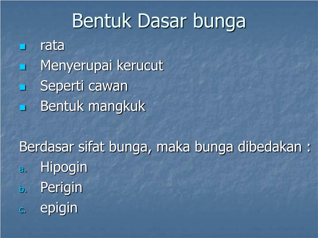 Bentuk Dasar bunga • rata • Menyerupai kerucut • Seperti cawan • Bentuk mangkuk Berdasar sifat bunga, maka bunga dibedakan : • Hipogin • Perigin • epigin
