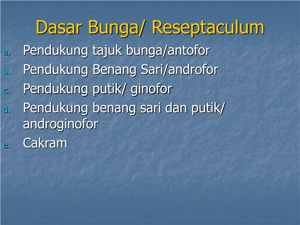 Dasar Bunga/ Reseptaculum • Pendukung tajuk bunga/antofor • Pendukung Benang Sari/androfor • Pendukung putik/ ginofor • Pendukung benang sari dan putik/ androginofor • Cakram