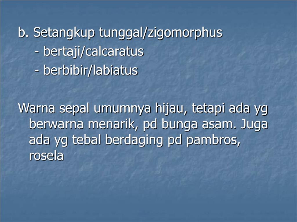 b. Setangkup tunggal/zigomorphus - bertaji/calcaratus - berbibir/labiatus Warna sepal umumnya hijau, tetapi ada yg berwarna menarik, pd bunga asam. Juga ada yg tebal berdaging pd pambros, rosela