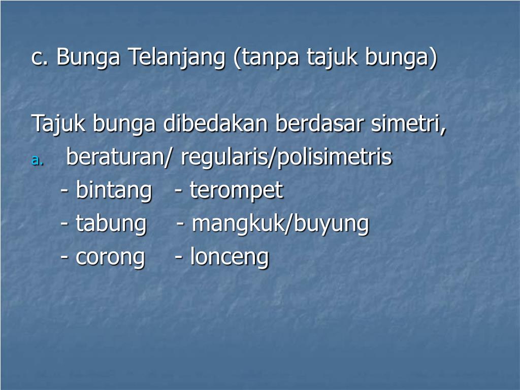 c. Bunga Telanjang (tanpa tajuk bunga) Tajuk bunga dibedakan berdasar simetri, • beraturan/ regularis/polisimetris - bintang - terompet - tabung - mangkuk/buyung - corong - lonceng