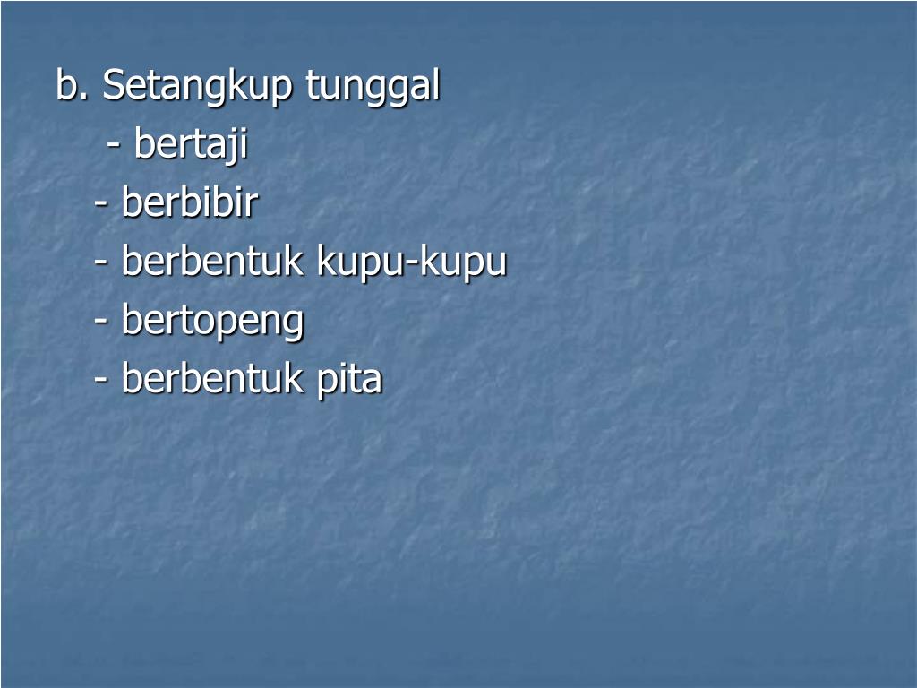 b. Setangkup tunggal - bertaji - berbibir - berbentuk kupu-kupu - bertopeng - berbentuk pita