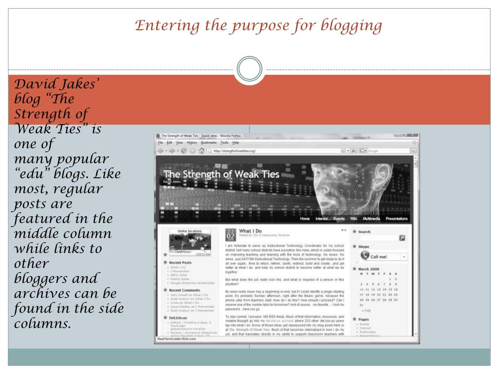 Entering the purpose for blogging David Jakes’ blog “The Strength of Weak Ties” is one ofmany popular “edu” blogs. Like most, regular posts arefeatured in the middle column while links to otherbloggers and archives can be found in the side columns.