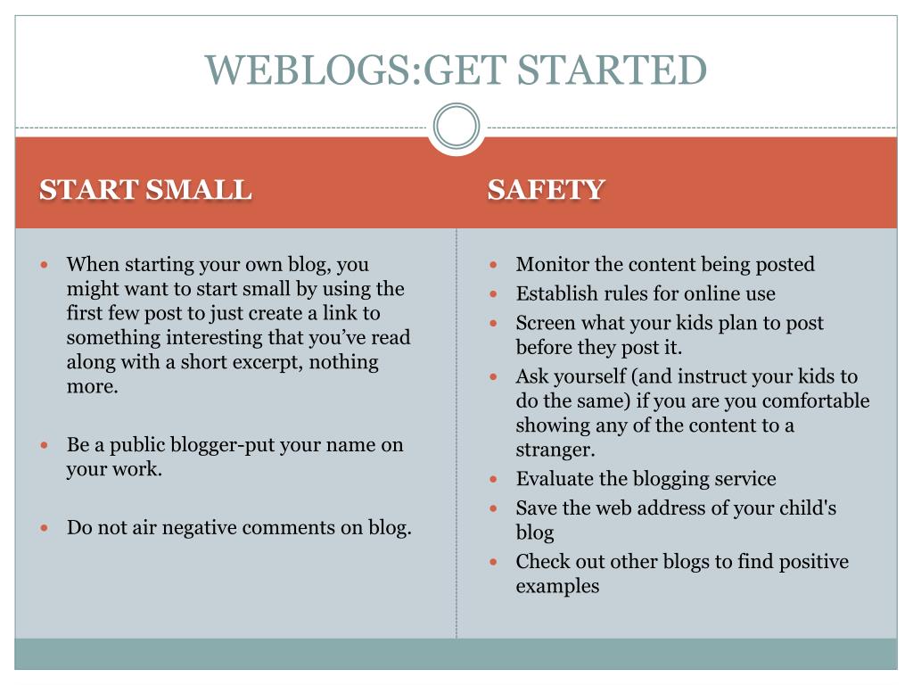 WEBLOGS:GET STARTED START SMALL SAFETY When starting your own blog, you might want to start small by using the first few post to just create a link to something interesting that you’ve read along with a short excerpt, nothing more. Be a public blogger-put your name on your work. Do not air negative comments on blog. Monitor the content being posted Establish rules for online use Screen what your kids plan to post before they post it. Ask yourself (and instruct your kids to do the same) if you are you comfortable showing any of the content to a stranger. Evaluate the blogging service Save the web address of your child's blog Check out other blogs to find positive examples