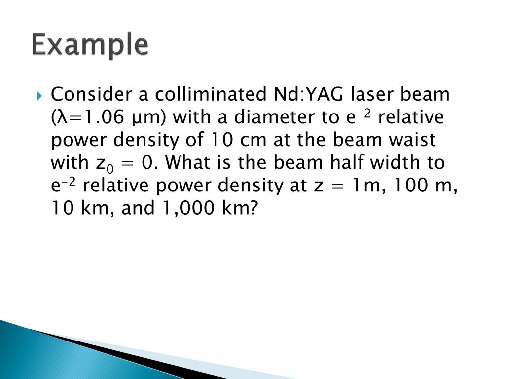 Example • Consider a colliminated Nd:YAG laser beam (λ=1.06 μm) with a diameter to e-2 relative power density of 10 cm at the beam waist with z0 = 0. What is the beam half width to e-2 relative power density at z = 1m, 100 m, 10 km, and 1,000 km?