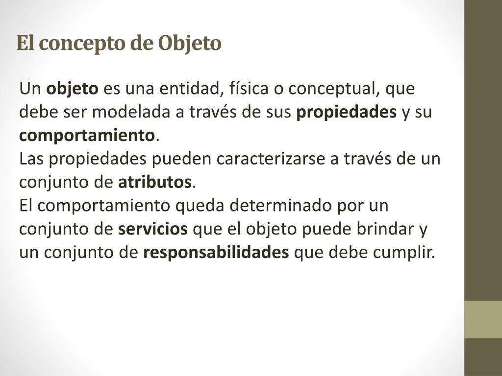 Un objeto es una entidad, física o conceptual, que debe ser modelada a través de sus propiedades y su comportamiento. Las propiedades pueden caracterizarse a través de un conjunto de atributos. El comportamiento queda determinado por un conjunto de servicios que el objeto puede brindar y un conjunto de responsabilidades que debe cumplir. El concepto de Objeto