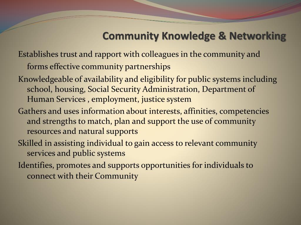 Community Knowledge & Networking Establishes trust and rapport with colleagues in the community and forms effective community partnerships Knowledgeable of availability and eligibility for public systems including school, housing, Social Security Administration, Department of Human Services , employment, justice system Gathers and uses information about interests, affinities, competencies and strengths to match, plan and support the use of community resources and natural supports Skilled in assisting individual to gain access to relevant community services and public systems Identifies, promotes and supports opportunities for individuals to connect with their Community