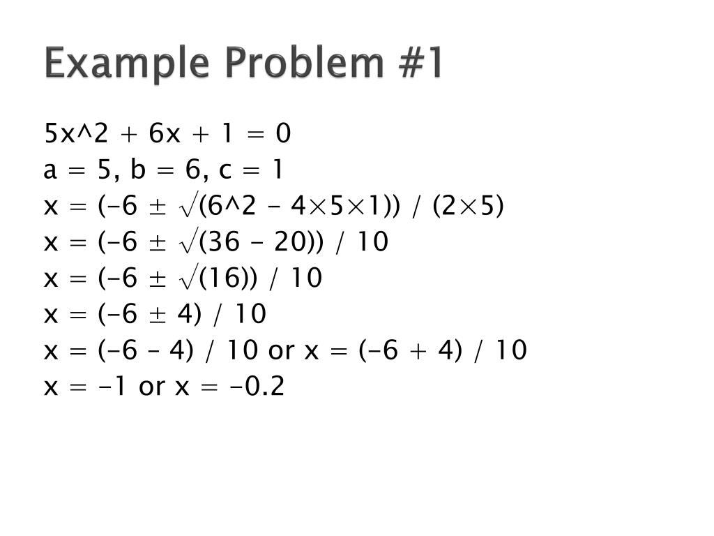 Example Problem #1 5x^2 + 6x + 1 = 0 a = 5, b = 6, c = 1 x = (-6 ± √(6^2 - 4×5×1)) / (2×5) x = (-6 ± √(36 - 20)) / 10 x = (-6 ± √(16)) / 10 x = (-6 ± 4) / 10 x = (-6 – 4) / 10 or x = (-6 + 4) / 10 x = -1 or x = -0.2
