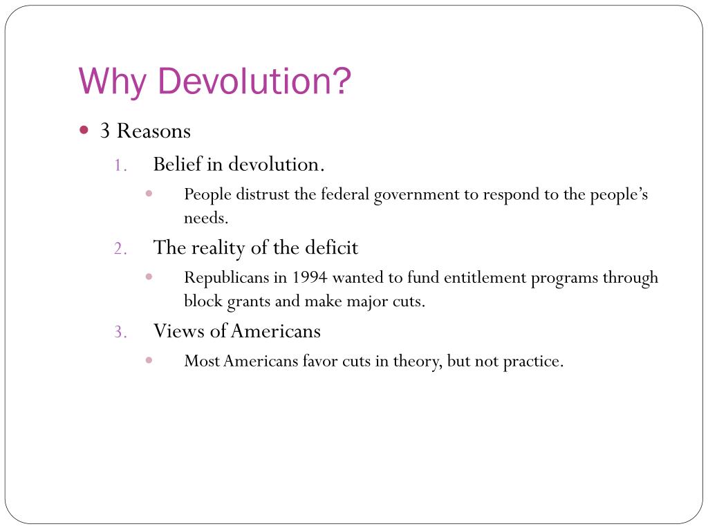 Why Devolution? • 3 Reasons • Belief in devolution. • People distrust the federal government to respond to the people’s needs. • The reality of the deficit • Republicans in 1994 wanted to fund entitlement programs through block grants and make major cuts. • Views of Americans • Most Americans favor cuts in theory, but not practice.