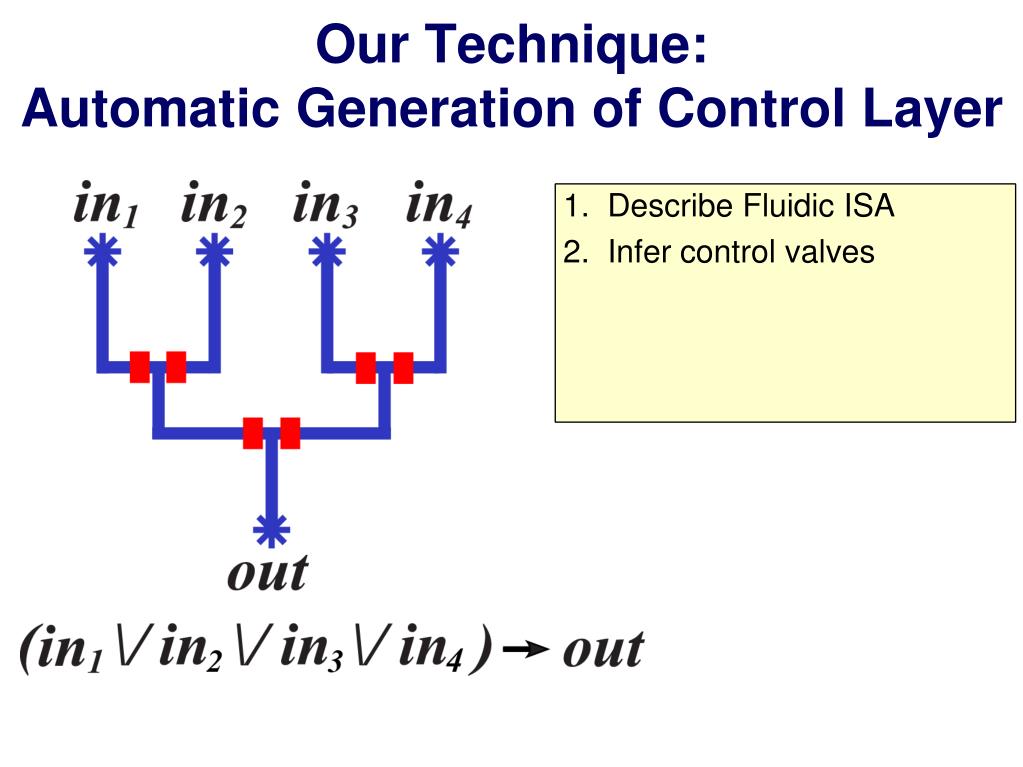 Our Technique:Automatic Generation of Control Layer 1. Describe Fluidic ISA 2. Infer control valves
