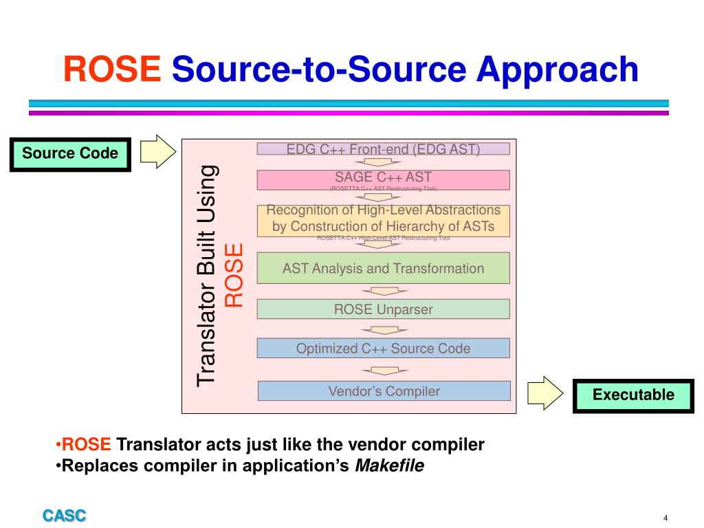 ROSE Compiler InfrastructureSource-to-Source Analysis and Optimization Dan Quinlan Rich Vuduc, Qing Yi, Markus Schordan Center for Applied Scientific Computing Lawrence Livermore National Laboratory This work was performed under the auspices of the U.S. Department of Energy by Lawrence Livermore National Laboratory under Contract W-7405-Eng-48.