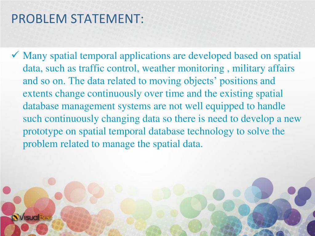 PROBLEM STATEMENT: • Many spatial temporal applications are developed based on spatial data, such as traffic control, weather monitoring , military affairs and so on. The data related to moving objects’ positions and extents change continuously over time and the existing spatial database management systems are not well equipped to handle such continuously changing data so there is need to develop a new prototype on spatial temporal database technology to solve the problem related to manage the spatial data.