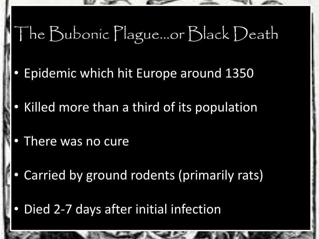 The Bubonic Plague…or Black Death • Epidemic which hit Europe around 1350 • Killed more than a third of its population • There was no cure • Carried by ground rodents (primarily rats) • Died 2-7 days after initial infection
