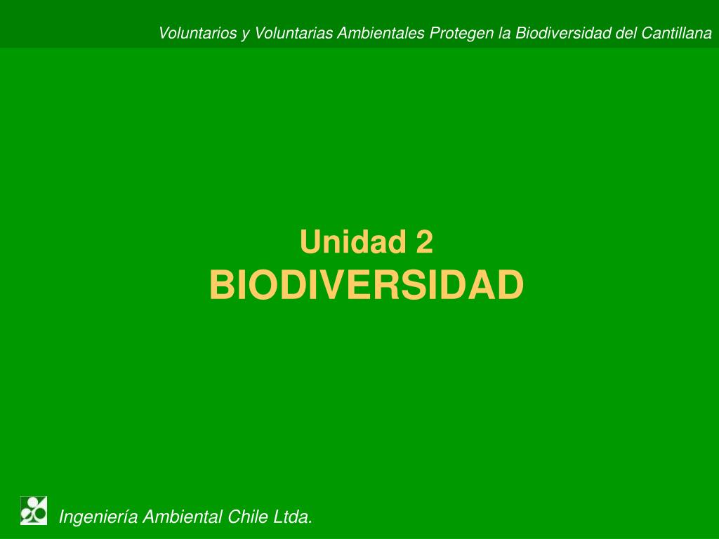 Unidad 2:BIODIVERSIDAD 1. Biodiversidad 2.Tipos y Dimensiones de la Biodiversidad 3.Valores de la Biodiversidad 4.Servicios Ambientales 5.Biodiversidad en el Mundo 6.Biodiversidad en Chile Ingeniería Ambiental Chile Ltda.