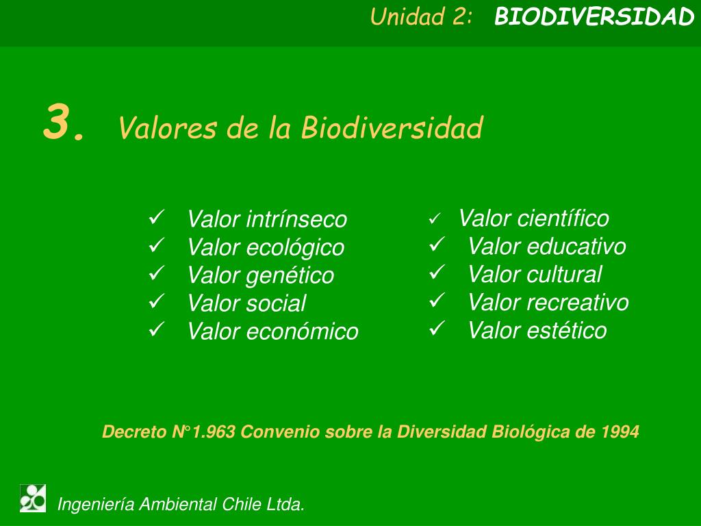 Unidad 2:BIODIVERSIDAD 3.Valores de la Biodiversidad • Valor científico • Valor educativo • Valor cultural • Valor recreativo • Valor estético • Valor intrínseco • Valor ecológico • Valor genético • Valor social • Valor económico Decreto N°1.963 Convenio sobre la Diversidad Biológica de 1994 Ingeniería Ambiental Chile Ltda.