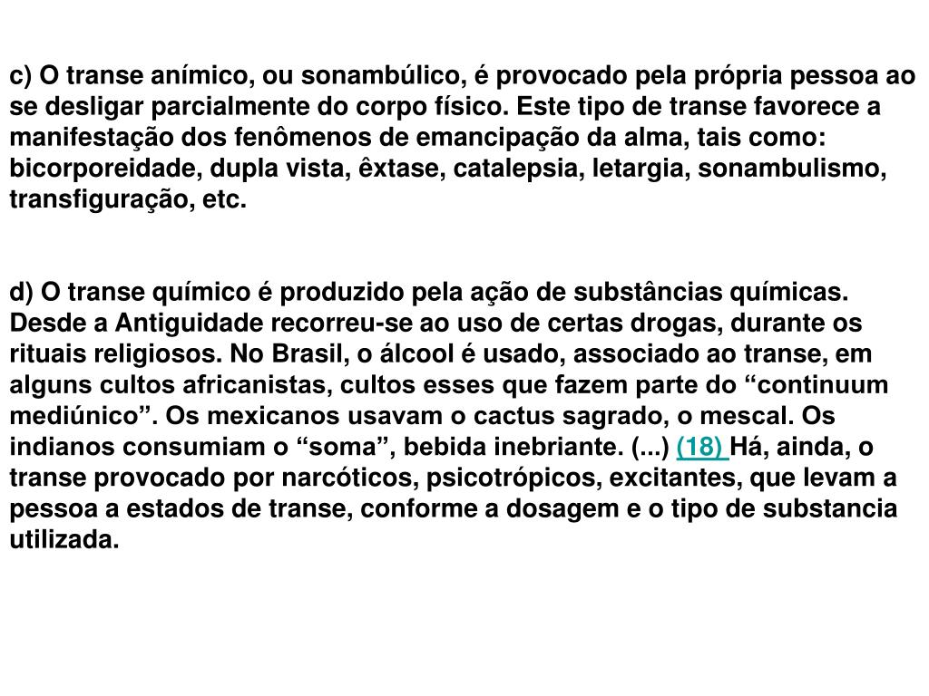 c) O transe anímico, ou sonambúlico, é provocado pela própria pessoa ao se desligar parcialmente do corpo físico. Este tipo de transe favorece a manifestação dos fenômenos de emancipação da alma, tais como: bicorporeidade, dupla vista, êxtase, catalepsia, letargia, sonambulismo, transfiguração, etc. d) O transe químico é produzido pela ação de substâncias químicas. Desde a Antiguidade recorreu-se ao uso de certas drogas, durante os rituais religiosos. No Brasil, o álcool é usado, associado ao transe, em alguns cultos africanistas, cultos esses que fazem parte do “continuum mediúnico”. Os mexicanos usavam o cactus sagrado, o mescal. Os indianos consumiam o “soma”, bebida inebriante. (...) (18) Há, ainda, o transe provocado por narcóticos, psicotrópicos, excitantes, que levam a pessoa a estados de transe, conforme a dosagem e o tipo de substancia utilizada.