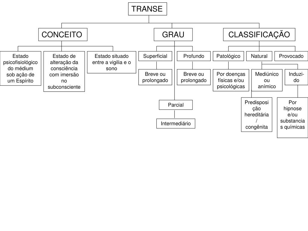TRANSE CONCEITO GRAU CLASSIFICAÇÃO Estado psicofisiológico do médium sob ação de um Espírito Estado de alteração da consciência com imersão no subconsciente Estado situado entre a vigilia e o sono Superficial Profundo Patológico Natural Provocado Breve ou prolongado Breve ou prolongado Por doenças físicas e/ou psicológicas Mediúnico ou anímico Induzi-do Predisposição hereditária / congênita Por hipnose e/ou substancias químicas Parcial Intermediário