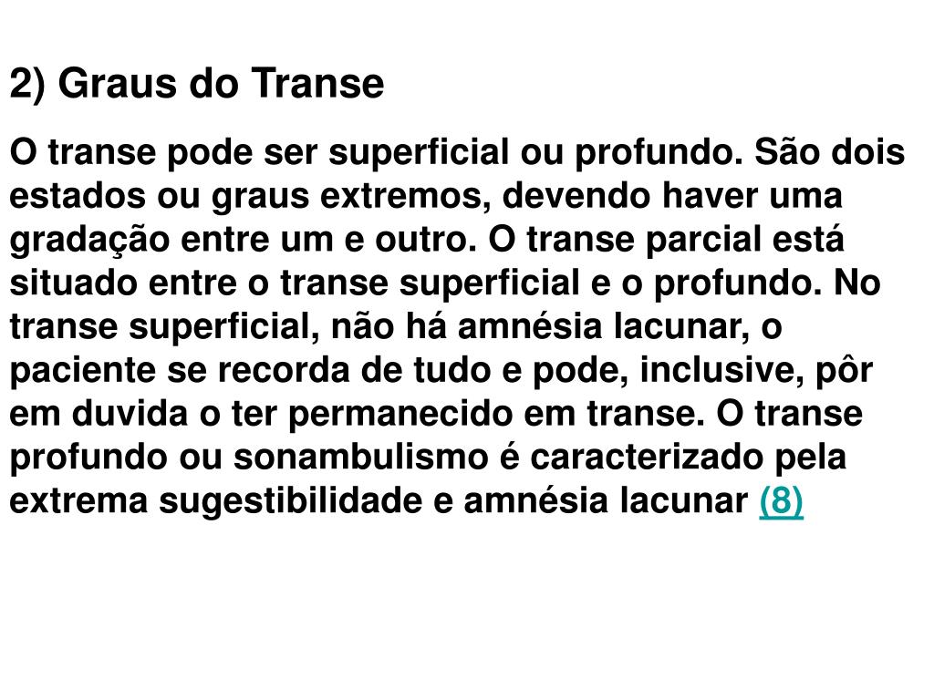 2) Graus do Transe O transe pode ser superficial ou profundo. São dois estados ou graus extremos, devendo haver uma gradação entre um e outro. O transe parcial está situado entre o transe superficial e o profundo. No transe superficial, não há amnésia lacunar, o paciente se recorda de tudo e pode, inclusive, pôr em duvida o ter permanecido em transe. O transe profundo ou sonambulismo é caracterizado pela extrema sugestibilidade e amnésia lacunar (8)