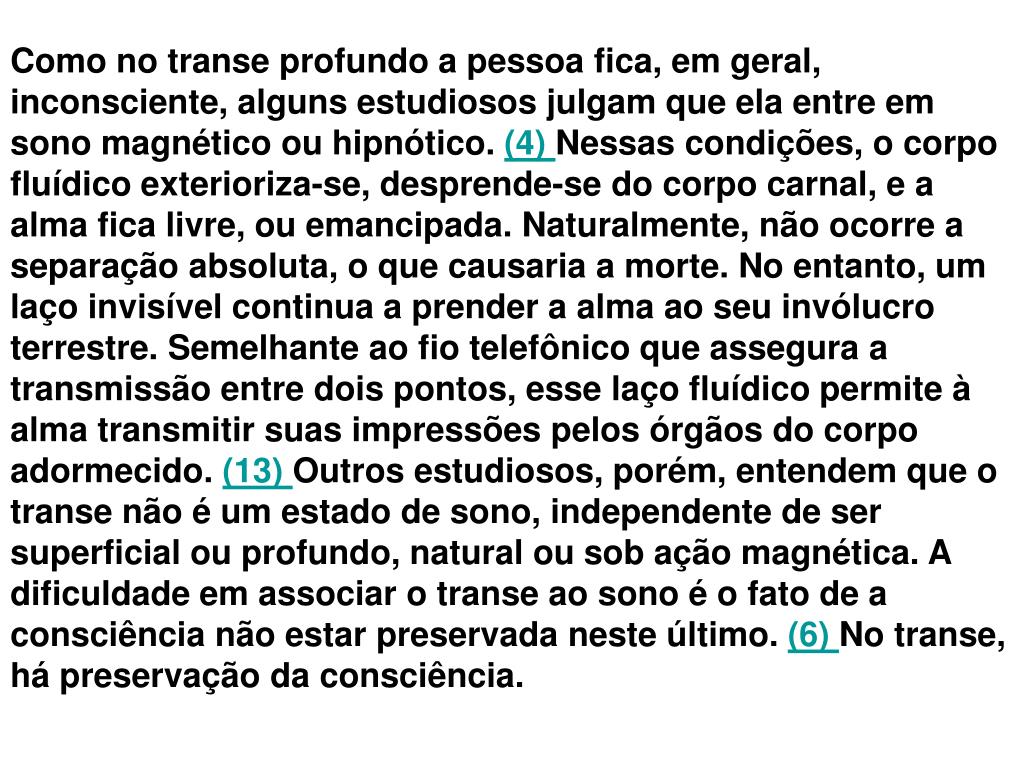 Como no transe profundo a pessoa fica, em geral, inconsciente, alguns estudiosos julgam que ela entre em sono magnético ou hipnótico. (4) Nessas condições, o corpo fluídico exterioriza-se, desprende-se do corpo carnal, e a alma fica livre, ou emancipada. Naturalmente, não ocorre a separação absoluta, o que causaria a morte. No entanto, um laço invisível continua a prender a alma ao seu invólucro terrestre. Semelhante ao fio telefônico que assegura a transmissão entre dois pontos, esse laço fluídico permite à alma transmitir suas impressões pelos órgãos do corpo adormecido. (13) Outros estudiosos, porém, entendem que o transe não é um estado de sono, independente de ser superficial ou profundo, natural ou sob ação magnética. A dificuldade em associar o transe ao sono é o fato de a consciência não estar preservada neste último. (6) No transe, há preservação da consciência.