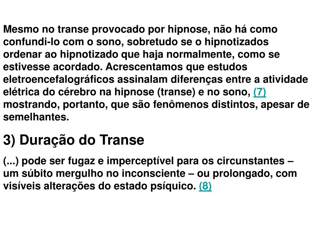 Mesmo no transe provocado por hipnose, não há como confundi-lo com o sono, sobretudo se o hipnotizados ordenar ao hipnotizado que haja normalmente, como se estivesse acordado. Acrescentamos que estudos eletroencefalográficos assinalam diferenças entre a atividade elétrica do cérebro na hipnose (transe) e no sono, (7) mostrando, portanto, que são fenômenos distintos, apesar de semelhantes. 3) Duração do Transe (...) pode ser fugaz e imperceptível para os circunstantes – um súbito mergulho no inconsciente – ou prolongado, com visíveis alterações do estado psíquico. (8)