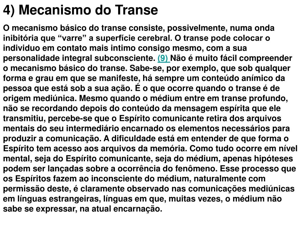 4) Mecanismo do Transe O mecanismo básico do transe consiste, possivelmente, numa onda inibitória que “varre” a superfície cerebral. O transe pode colocar o individuo em contato mais intimo consigo mesmo, com a sua personalidade integral subconsciente. (9) Não é muito fácil compreender o mecanismo básico do transe. Sabe-se, por exemplo, que sob qualquer forma e grau em que se manifeste, há sempre um conteúdo anímico da pessoa que está sob a sua ação. É o que ocorre quando o transe é de origem mediúnica. Mesmo quando o médium entre em transe profundo, não se recordando depois do conteúdo da mensagem espírita que ele transmitiu, percebe-se que o Espírito comunicante retira dos arquivos mentais do seu intermediário encarnado os elementos necessários para produzir a comunicação. A dificuldade está em entender de que forma o Espírito tem acesso aos arquivos da memória. Como tudo ocorre em nível mental, seja do Espírito comunicante, seja do médium, apenas hipóteses podem ser lançadas sobre a ocorrência do fenômeno. Esse processo que os Espíritos fazem ao inconsciente do médium, naturalmente com permissão deste, é claramente observado nas comunicações mediúnicas em línguas estrangeiras, línguas em que, muitas vezes, o médium não sabe se expressar, na atual encarnação.