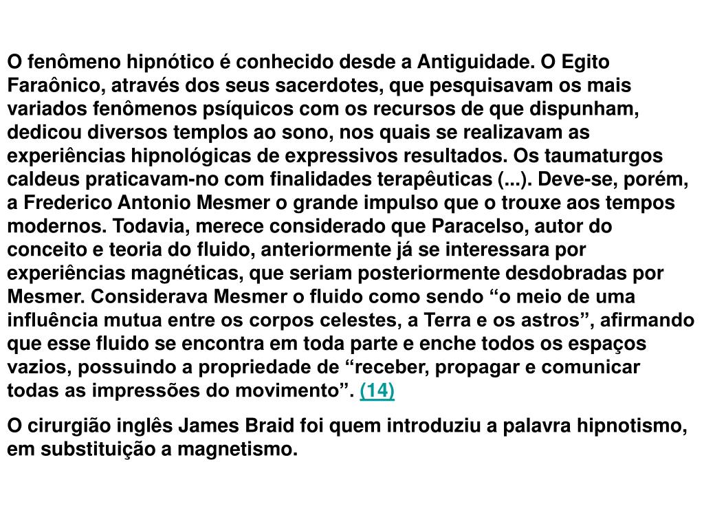 O fenômeno hipnótico é conhecido desde a Antiguidade. O Egito Faraônico, através dos seus sacerdotes, que pesquisavam os mais variados fenômenos psíquicos com os recursos de que dispunham, dedicou diversos templos ao sono, nos quais se realizavam as experiências hipnológicas de expressivos resultados. Os taumaturgos caldeus praticavam-no com finalidades terapêuticas (...). Deve-se, porém, a Frederico Antonio Mesmer o grande impulso que o trouxe aos tempos modernos. Todavia, merece considerado que Paracelso, autor do conceito e teoria do fluido, anteriormente já se interessara por experiências magnéticas, que seriam posteriormente desdobradas por Mesmer. Considerava Mesmer o fluido como sendo “o meio de uma influência mutua entre os corpos celestes, a Terra e os astros”, afirmando que esse fluido se encontra em toda parte e enche todos os espaços vazios, possuindo a propriedade de “receber, propagar e comunicar todas as impressões do movimento”. (14) O cirurgião inglês James Braid foi quem introduziu a palavra hipnotismo, em substituição a magnetismo.