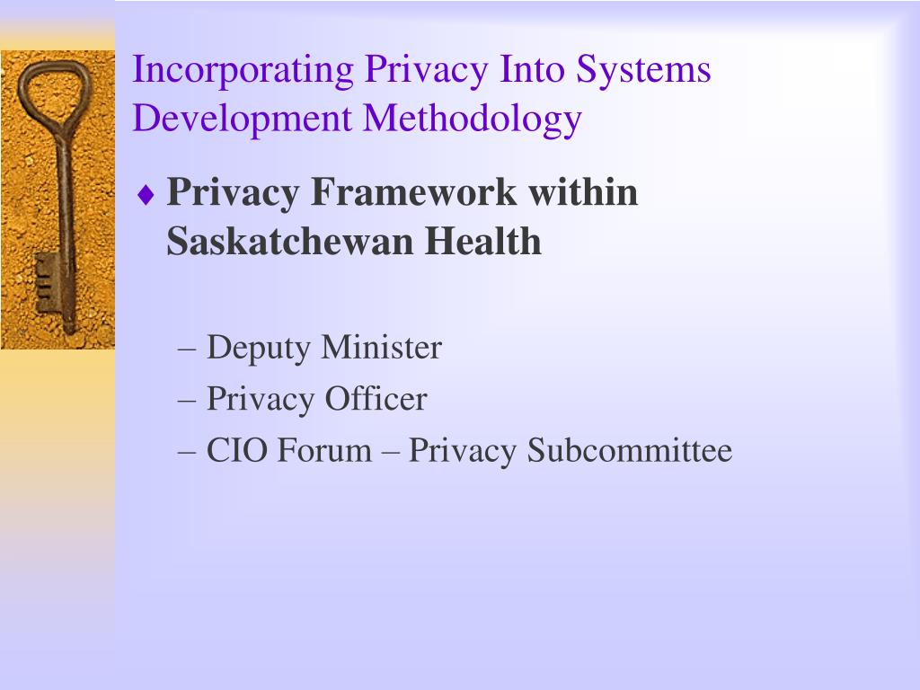 Incorporating Privacy Into Systems Development Methodology While formally including privacy as part of the systems development methodology is a work in progress, “Protecting the privacy of information with appropriate security has always been and remains a top priority for Saskatchewan Health”