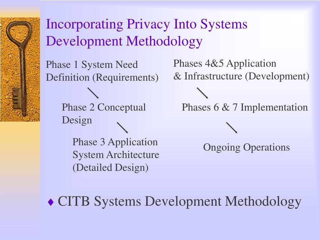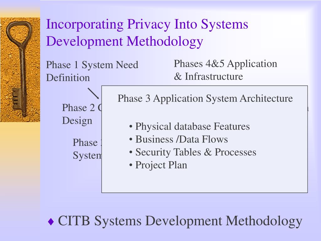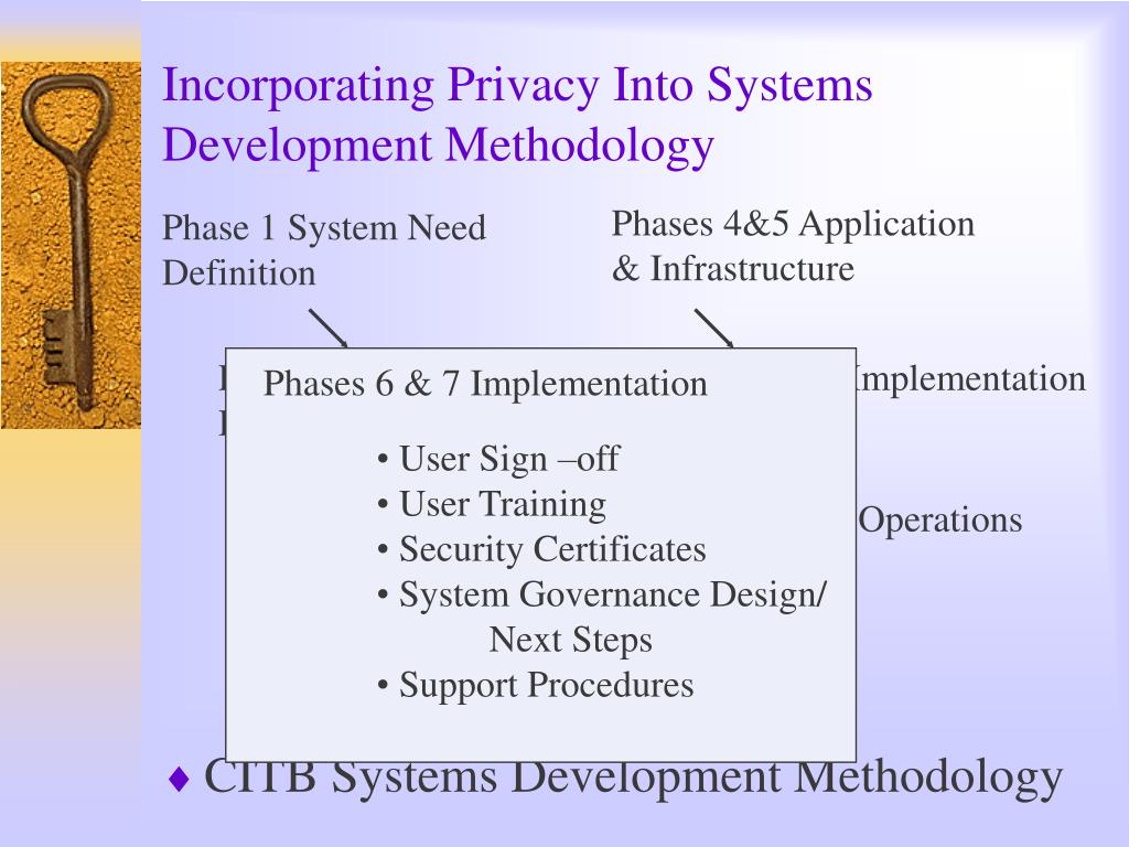 Incorporating Privacy Into Systems Development Methodology Phases 4&5 Application & Infrastructure • CITB Systems Development Methodology Phase 1 System Need Definition Phase 2 Conceptual Design Phases 6 & 7 Implementation Phase 3 Application System Architecture Ongoing Operations