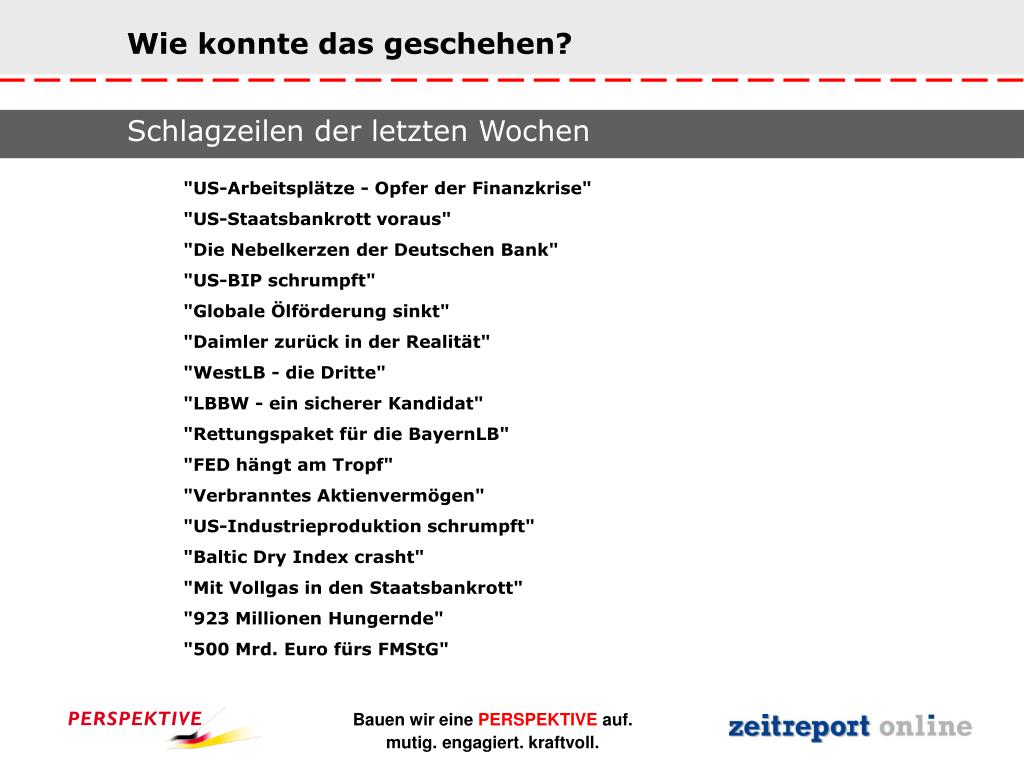 Wie konnte das geschehen? Schlagzeilen der letzten Wochen "US-Arbeitsplätze - Opfer der Finanzkrise" "US-Staatsbankrott voraus" "Die Nebelkerzen der Deutschen Bank" "US-BIP schrumpft" "Globale Ölförderung sinkt" "Daimler zurück in der Realität" "WestLB - die Dritte" "LBBW - ein sicherer Kandidat" "Rettungspaket für die BayernLB" "FED hängt am Tropf" "Verbranntes Aktienvermögen" "US-Industrieproduktion schrumpft" "Baltic Dry Index crasht" "Mit Vollgas in den Staatsbankrott" "923 Millionen Hungernde" "500 Mrd. Euro fürs FMStG"