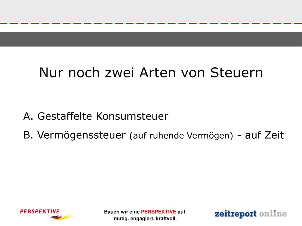 Nur noch zwei Arten von Steuern A. Gestaffelte Konsumsteuer B. Vermögenssteuer (auf ruhende Vermögen) - auf Zeit