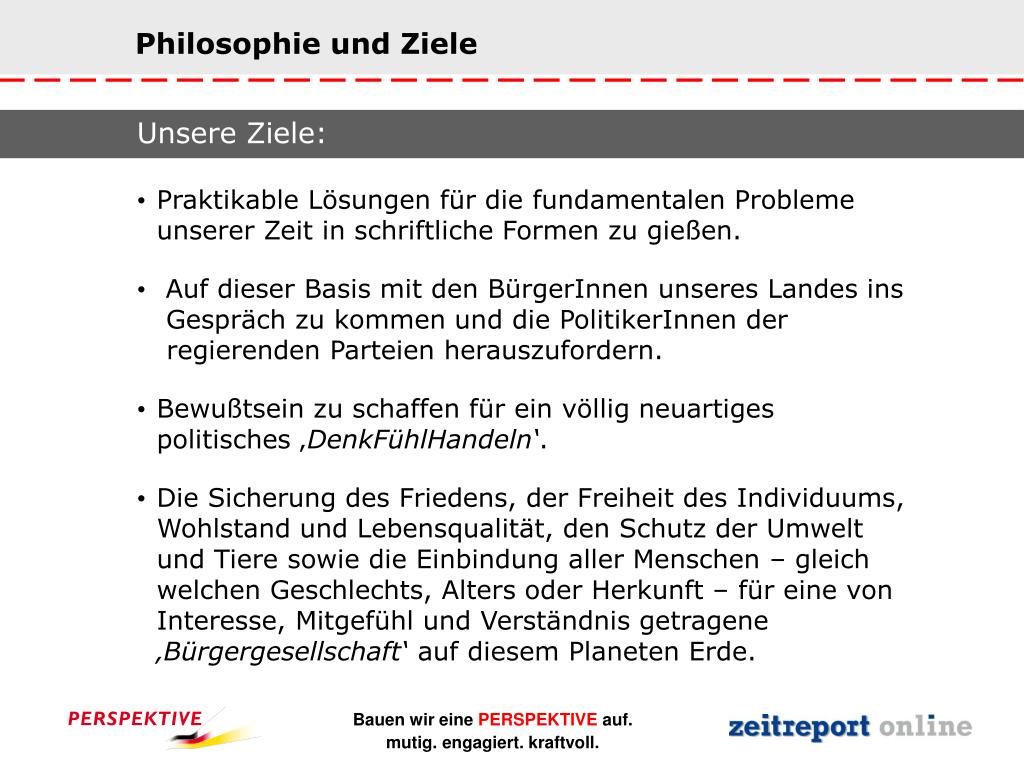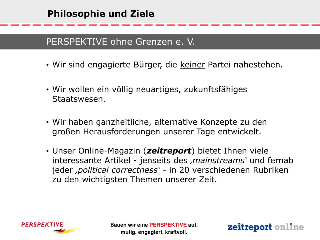 Philosophie und Ziele • PERSPEKTIVE ohne Grenzen e. V. • Wir sind engagierte Bürger, die keiner Partei nahestehen. • Wir wollen ein völlig neuartiges, zukunftsfähiges Staatswesen. • Wir haben ganzheitliche, alternative Konzepte zu den großen Herausforderungen unserer Tage entwickelt. • Unser Online-Magazin (zeitreport) bietet Ihnen viele interessante Artikel - jenseits des ‚mainstreams‘ und fernab jeder ‚political correctness‘ - in 20 verschiedenen Rubriken zu den wichtigsten Themen unserer Zeit.