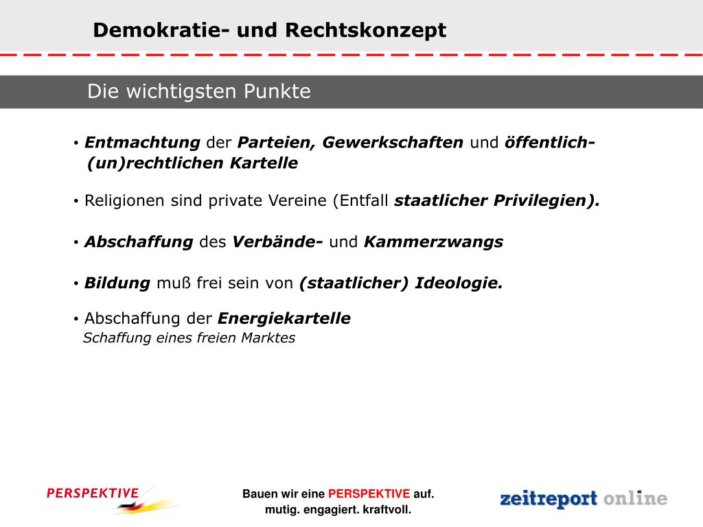 Demokratie- und Rechtskonzept • Die wichtigsten Punkte • Entmachtung der Parteien, Gewerkschaften und öffentlich- (un)rechtlichen Kartelle • Religionen sind private Vereine (Entfall staatlicher Privilegien). • Abschaffung des Verbände- und Kammerzwangs • Bildung muß frei sein von (staatlicher) Ideologie. • Abschaffungder Energiekartelle • Schaffung eines freien Marktes