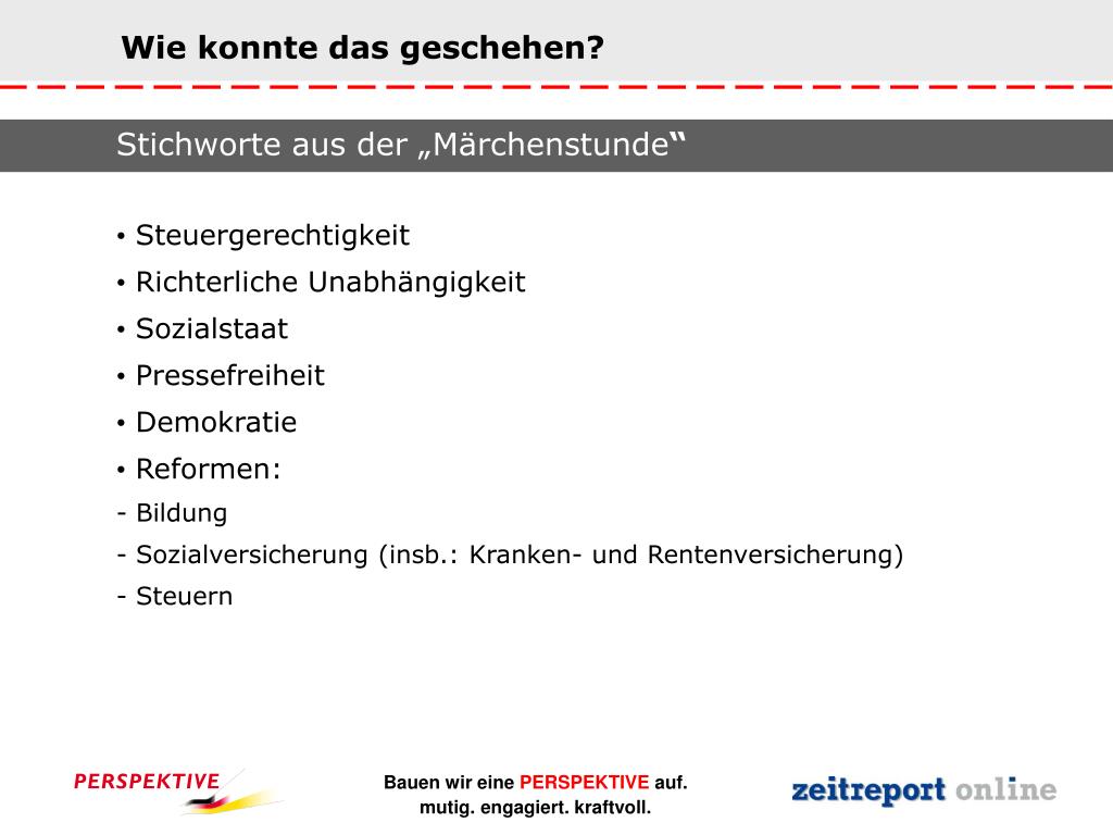 Wie konnte das geschehen? • Stichworte aus der „Märchenstunde“ • Steuergerechtigkeit • Richterliche Unabhängigkeit • Sozialstaat • Pressefreiheit • Demokratie • Reformen: • - Bildung • - Sozialversicherung (insb.: Kranken- und Rentenversicherung) • - Steuern