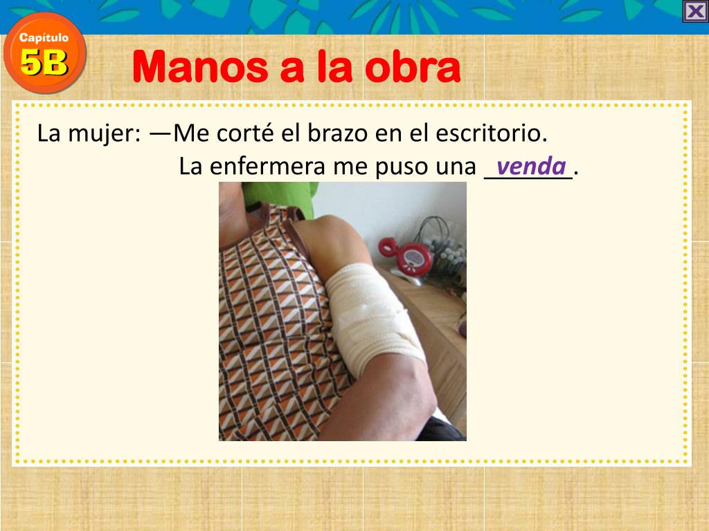 Manos a la obra La mujer: —Me corté el brazo en el escritorio. La enfermera me puso una .