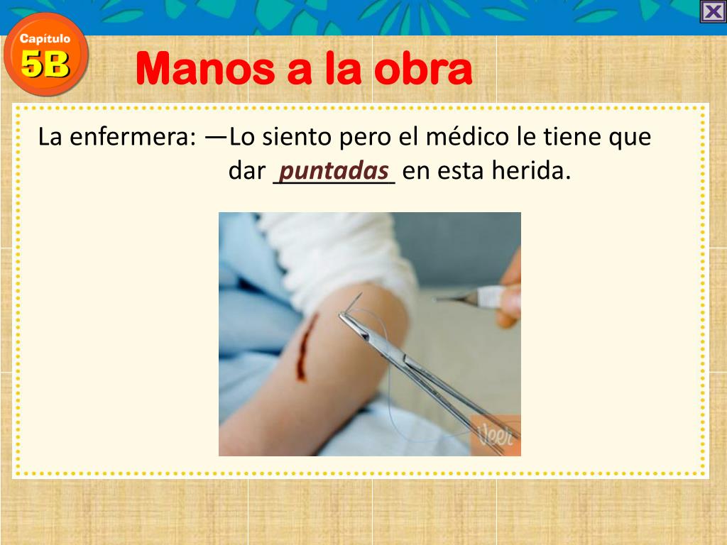 Manos a la obra La enfermera: —Lo siento pero el médico le tiene que dar puntadas en esta herida.