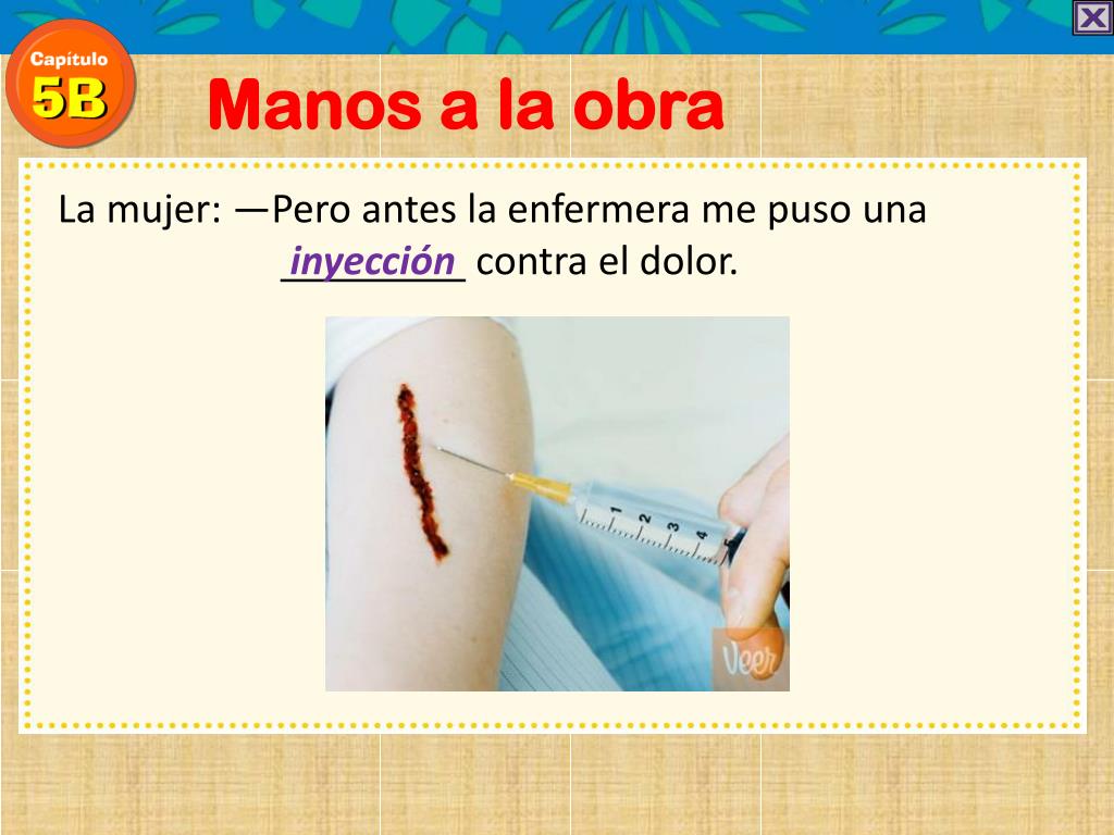 Manos a la obra La mujer: —Pero antes la enfermera me puso una inyección contra el dolor.