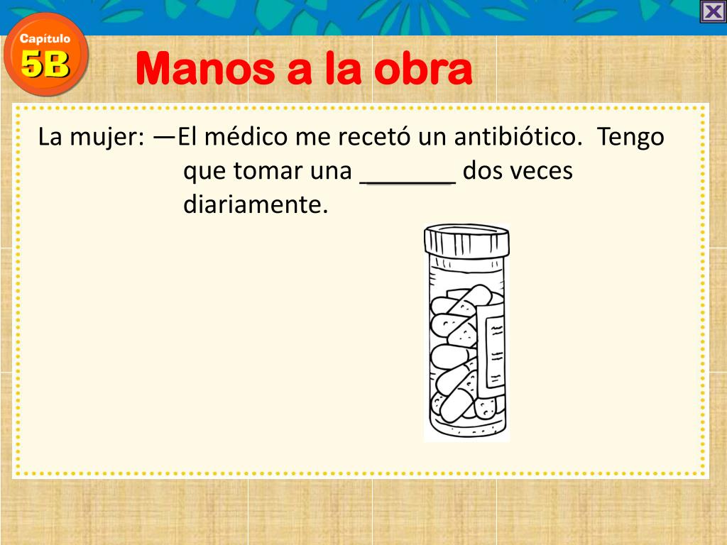 Manos a la obra La mujer: —El médico me recetó un antibiótico.Tengo que tomar una pastilla dos veces diariamente.