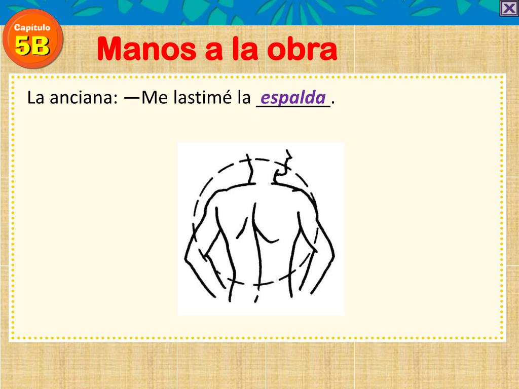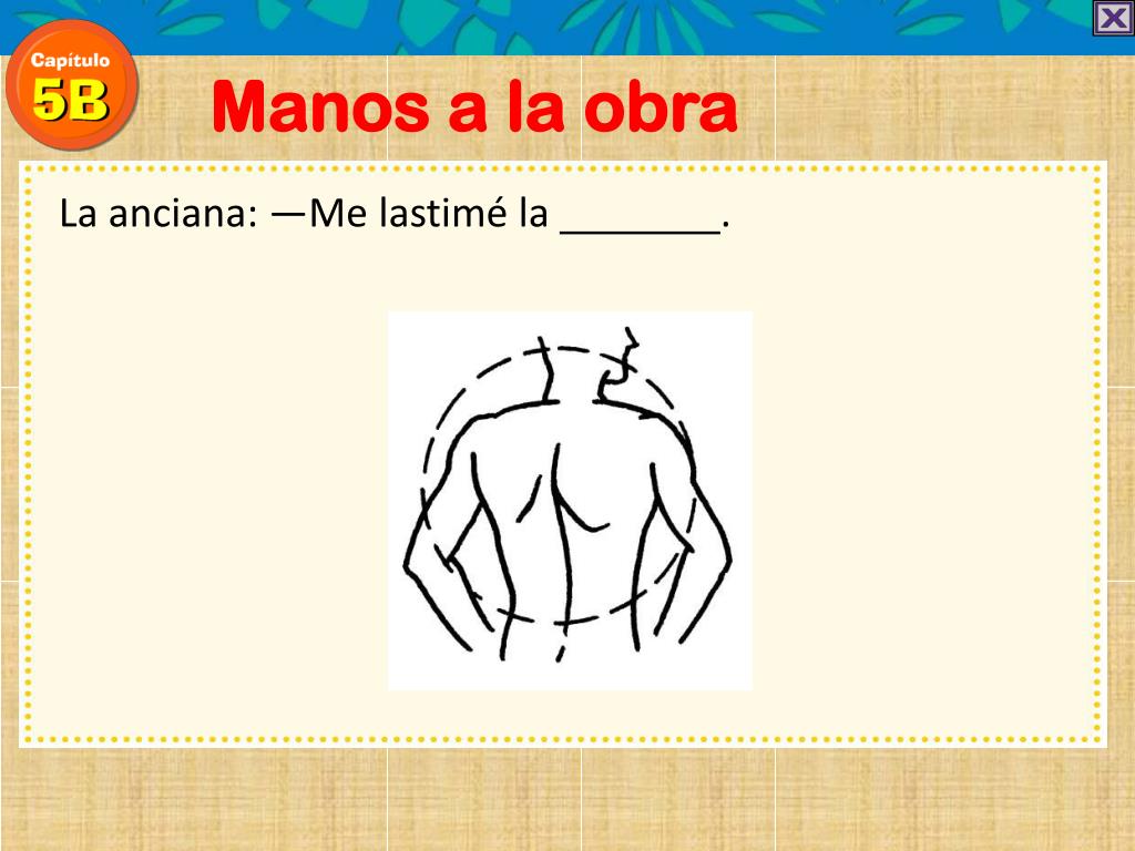 Manos a la obra La anciana: —Me lastimé la espalda . Y me duelen los .