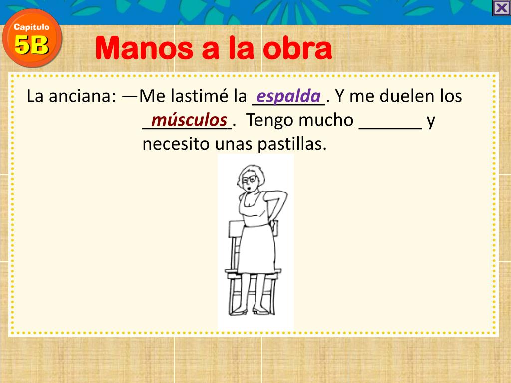 Manos a la obra La anciana: —Me lastimé la espalda . Y me duelen los músculos. Tengo mucho dolor y necesito unas pastillas.