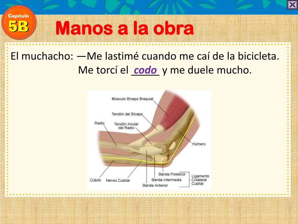 Manos a la obra El muchacho: —Me lastimé cuando me caí de la bicicleta. Me torcí el codo y me duele mucho.