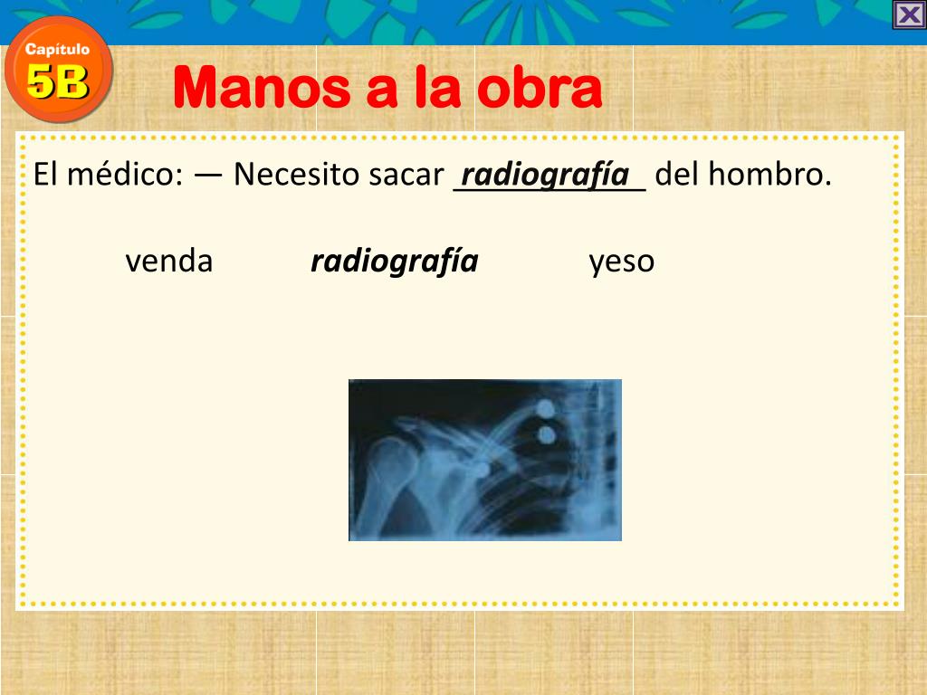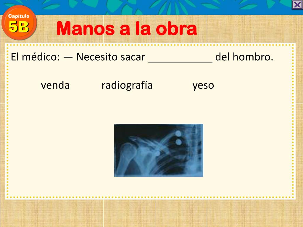 Manos a la obra El médico: — Necesito sacar radiografía del hombro. venda radiografía yeso