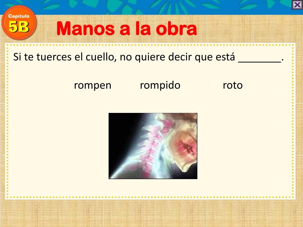 Manos a la obra Cuando el cuello está roto, el paciente no puede moverse facilmente porque los músculos se rompen también. rompen rompido roto