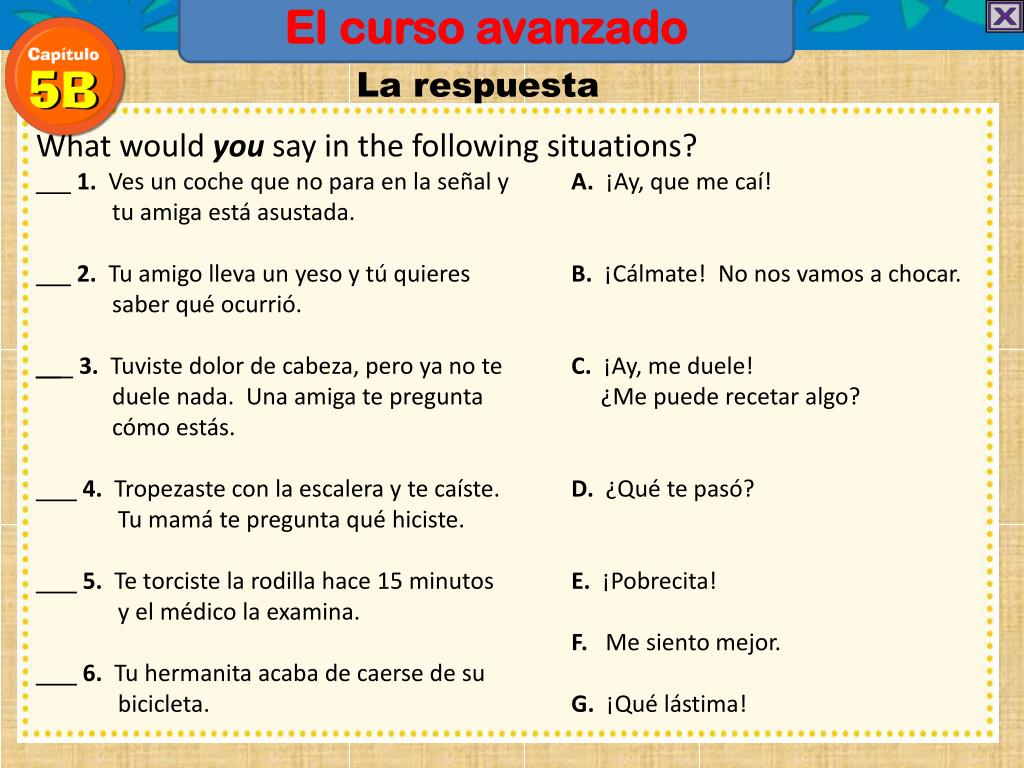 El curso avanzado La respuesta • What would you say in the following situations? • 1. Ves un coche que no para en la señal yA. ¡Ay, que me caí! • tu amiga está asustada. • 2. Tu amigo lleva un yeso y tú quieres B. ¡Cálmate! No nos vamos a chocar. • saber qué ocurrió. • __ 3. Tuviste dolor de cabeza, pero ya no te C. ¡Ay, me duele! • duele nada. Una amiga te pregunta ¿Me puede recetar algo? • cómo estás. • 4. Tropezaste con la escalera y te caíste. D. ¿Qué te pasó? • Tu mamá te pregunta qué hiciste. • 5. Te torciste la rodilla hace 15 minutos E. ¡Pobrecita! • y el médico la examina. • F. Me siento mejor. • 6. Tu hermanita acaba de caerse de su • bicicleta. G. ¡Qué lástima!