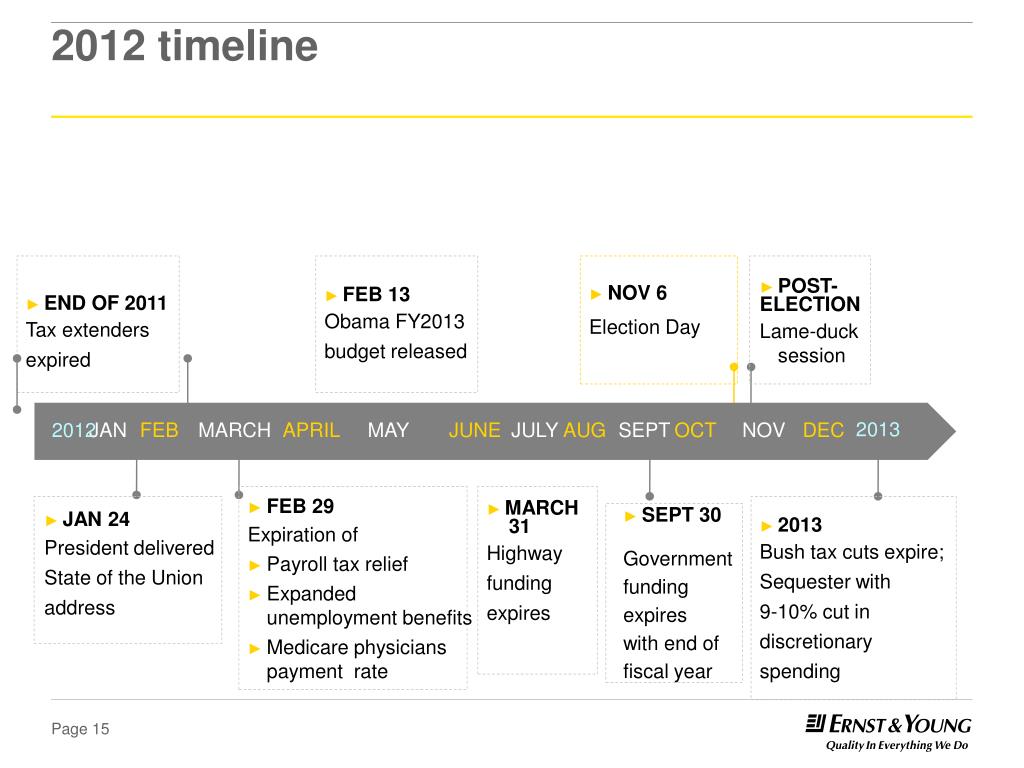2012 timeline • POST- • ELECTION • Lame-duck session • FEB 13 • Obama FY2013 • budget released • NOV 6 • Election Day • END OF 2011 • Tax extenders • expired 2013 2012 JAN FEB MARCH APRIL MAY JUNE JULY AUG SEPT OCT NOV DEC • JAN 24 • President delivered • State of the Union • address • MARCH • 31 • Highway • funding • expires • 2013 • Bush tax cuts expire; • Sequester with • 9-10% cut in • discretionary • spending • SEPT 30 • Government • funding • expires • with end of • fiscal year • FEB 29 • Expiration of • Payroll tax relief • Expanded unemployment benefits • Medicare physicians payment rate