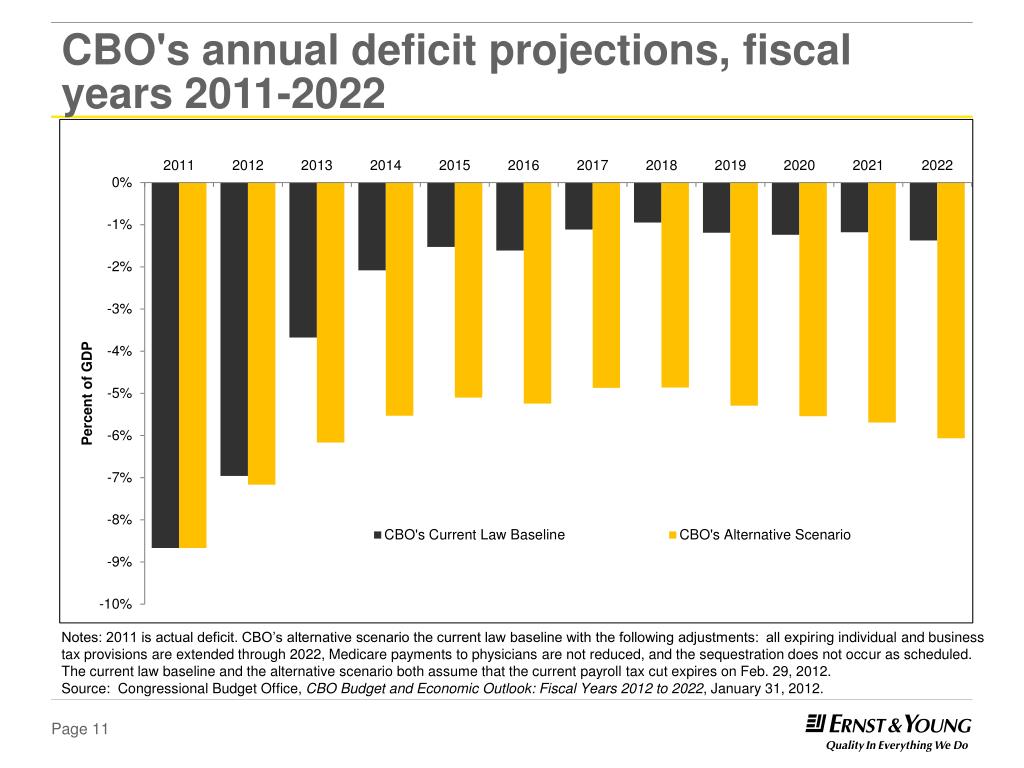 CBO's annual deficit projections, fiscal years 2011-2022 Notes: 2011 is actual deficit. CBO’s alternative scenario the current law baseline with the following adjustments: all expiring individual and business tax provisions are extended through 2022, Medicare payments to physicians are not reduced, and the sequestration does not occur as scheduled. The current law baseline and the alternative scenario both assume that the current payroll tax cut expires on Feb. 29, 2012. Source: Congressional Budget Office, CBO Budget and Economic Outlook: Fiscal Years 2012 to 2022, January 31, 2012.
