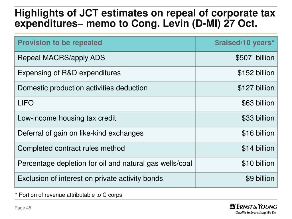 Highlights of JCT estimates on repeal of corporate tax expenditures– memo to Cong. Levin (D-MI) 27 Oct. * Portion of revenue attributable to C corps